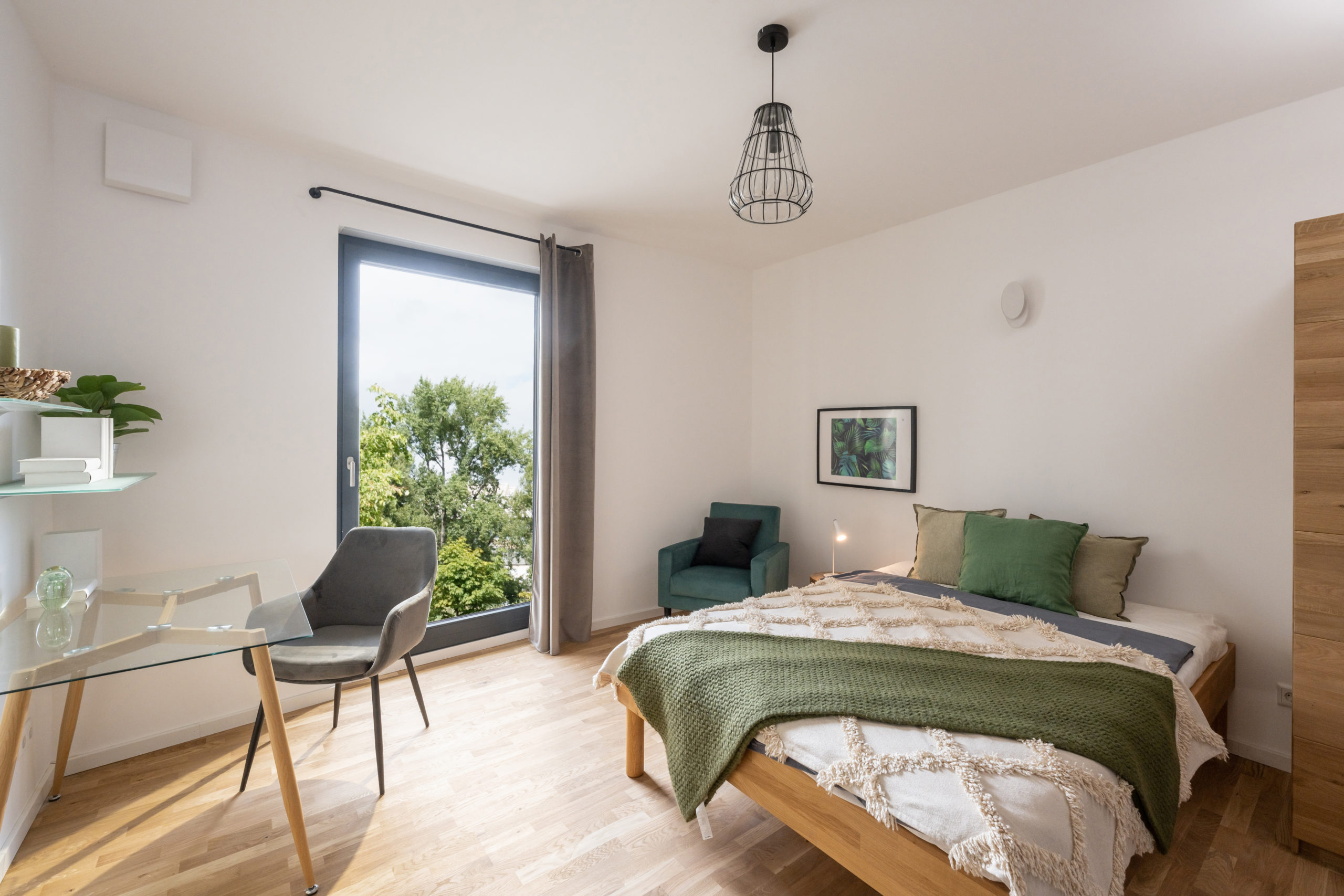 | Ausstattung | - Neubau - fast alle Apartments verfügen über einen Balkon oder im Erdgeschoss eine befestigte Terrasse - Lobby mit Conciergeservice - attraktive Grünanlagen mit Grillfläche und Basketballfeld - hochwertige Ausstattung - vollständige Möblierung & Kitchenette - Personenaufzug - Parkett & Fußbodenheizung - freies WLAN, Paketraum, Waschsalon - Community Lounge mit Coworking Spaces - Zugangsteuerung zu den Apartments per App - ausreichend Fahrradstellplätze |