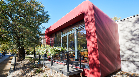 Das futuristisch anmutende café p. serviert drinnen und draußen wechselnde Gerichte, die durch Frische überzeugen.